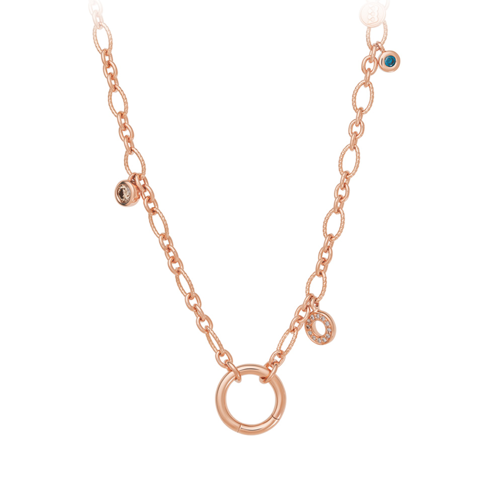 Halskette mit verschlungenen, massivgoldenen Gliedern sowie Mini-Anhängern aus verschiedenfarbigen Diamanten. In den Ring können verschiedene Abhänger eingehängt werden. Très chic!