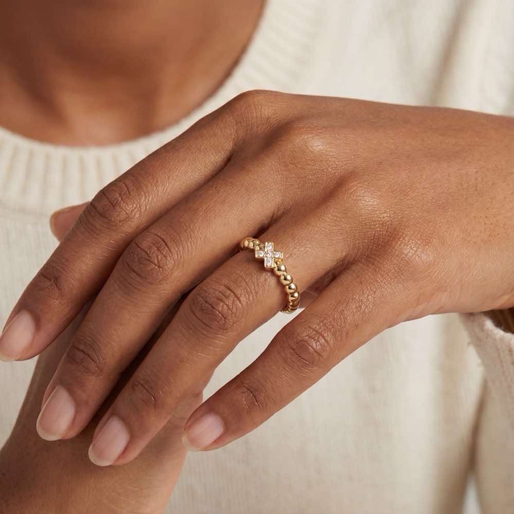Sportlicher Ring mit weißen Diamanten und dem für Bron berühmten Küsschen-Motiv.  Très chic!