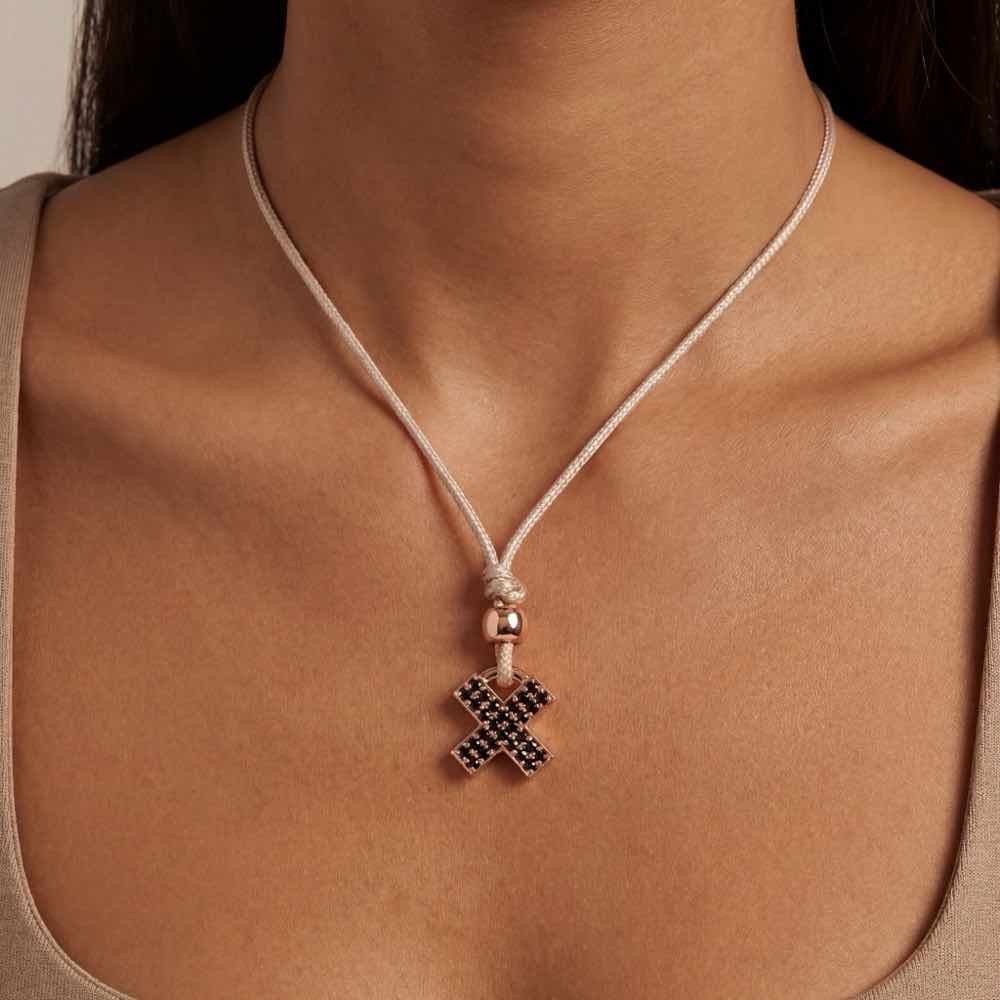 Anhänger Joy aus der Kollektion City Garden – die Mutter aller Bron-Küsschen. Besetzt mit schwarzen Korunden, getragen an einer lässigen Kordel mit Goldelement. Gefertigt aus 18-karätigem Roségold.