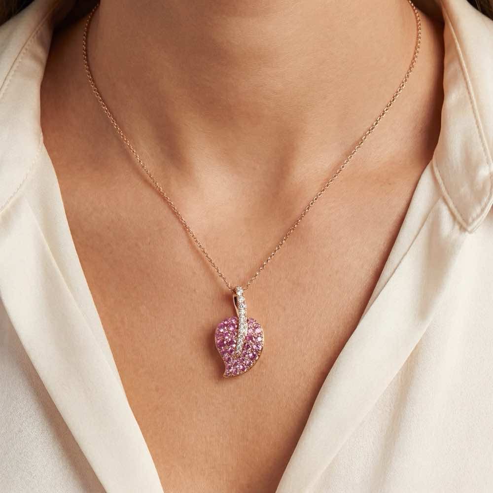 Charmanter Anhänger mit einem schwungvollen Blattmotiv, welches mit rosa Saphiren besetzt ist und mit weißen Diamanten akzentuiert wird. In feiner Handarbeit aus hochwertigem Roségold 750/- gefertigt. Komplettiert wird der Anhänger durch ein zartes Collierkettchen im Ankermuster aus Roségold 750/-.