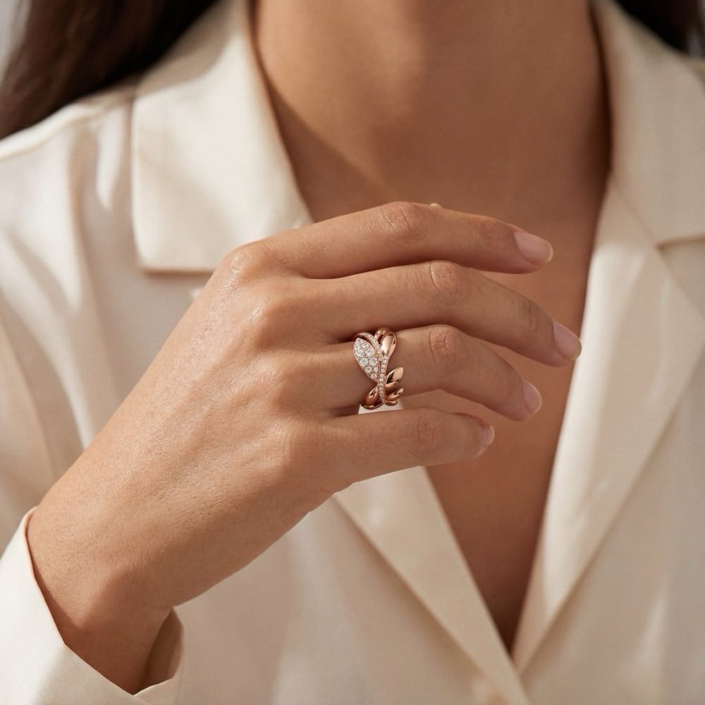 Charmanter Ring aus Blattmotiven, die teilweise mit weißen Diamanten besetzt sind. In feiner Handarbeit aus hochwertigem Roségold 750/- gefertigt.