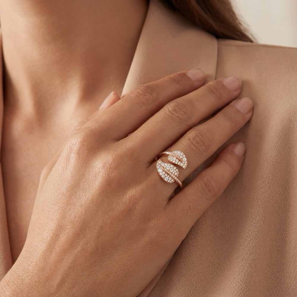 Charmanter Ring aus Blattmotiven, die mit weißen Diamanten besetzt sind. In feiner Handarbeit aus hochwertigem Roségold 750/- gefertigt.