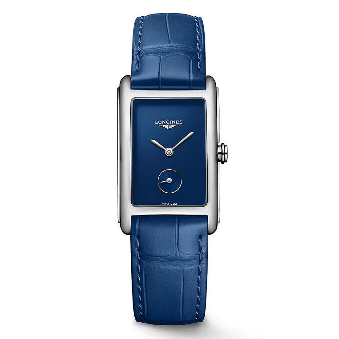 Longines DolceVita in einer rechteckigen Form mit blauem Zifferblatt. Kratzfestes Saphirglas, Quarzwerk, Lederarmband und Edelstahlgehäuse.