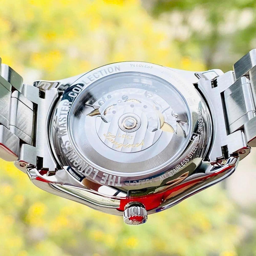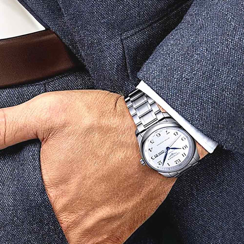 Bereits auf den ersten Blick fällt der abgesetzte Kronenrand des Edelstahlgehäuses ins Auge, der das Design elegant abrundet. Mit dieser Gestaltung setzt die Master Collection von Longines klare Akzente. Auf dem silberfarbenen Zifferblatt mit fein gearbeiteter Guillochierung kommen die modernen blauen Blattzeiger besonders gut zur Geltung. Die arabischen Ziffern zeigen sich harmonisch geschwungen. Neben der Datumsanzeige präsentiert ein Fenster bei 3 Uhr zudem den Wochentag.