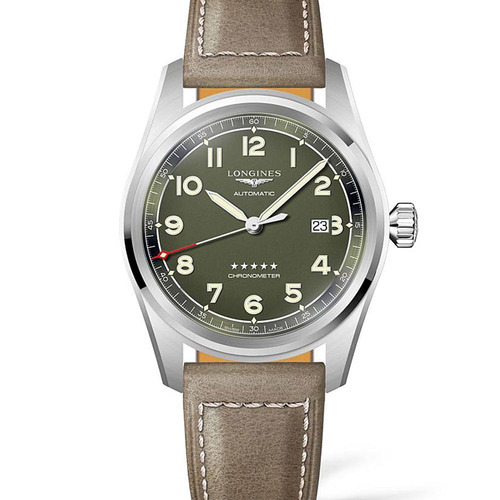 Longines Spirit in 42 Millimeter Durchmesser, Zifferblatt mattgrün. Kratzfestes Saphirglas mit mehreren Antireflexschichten, mechanisches Uhrwerk mit Automatikaufzug. COSC-zertifizierter Chronometer, Lederarmband und Gehäuse in Edelstahl.