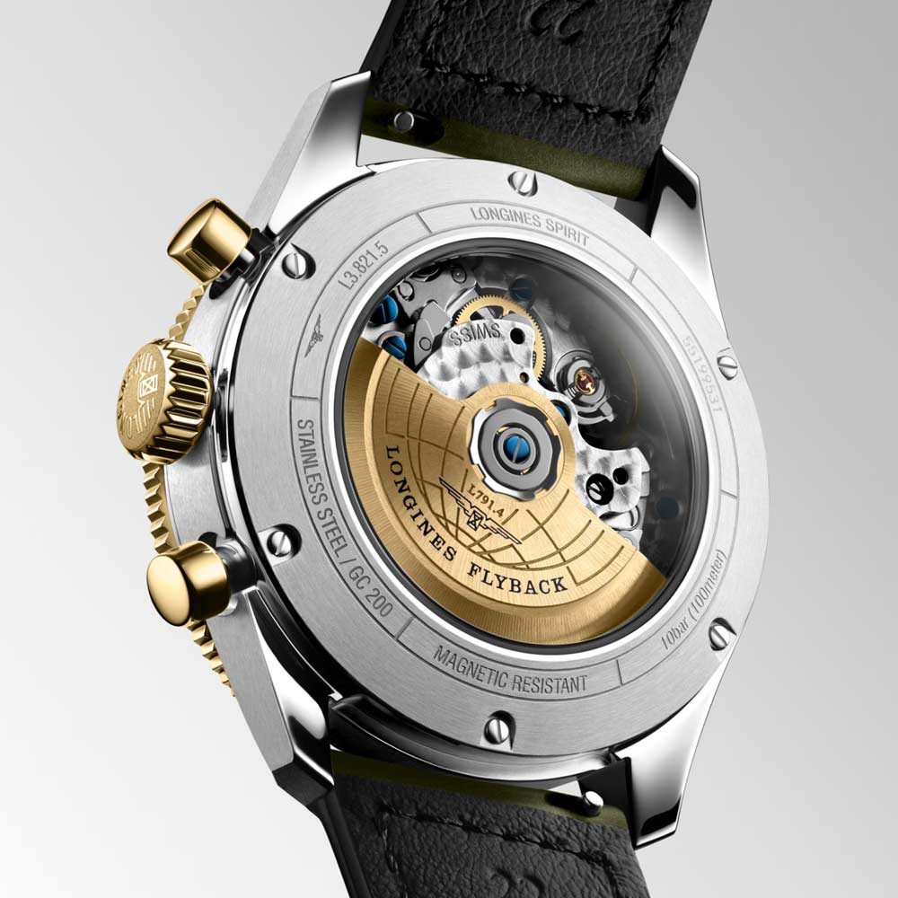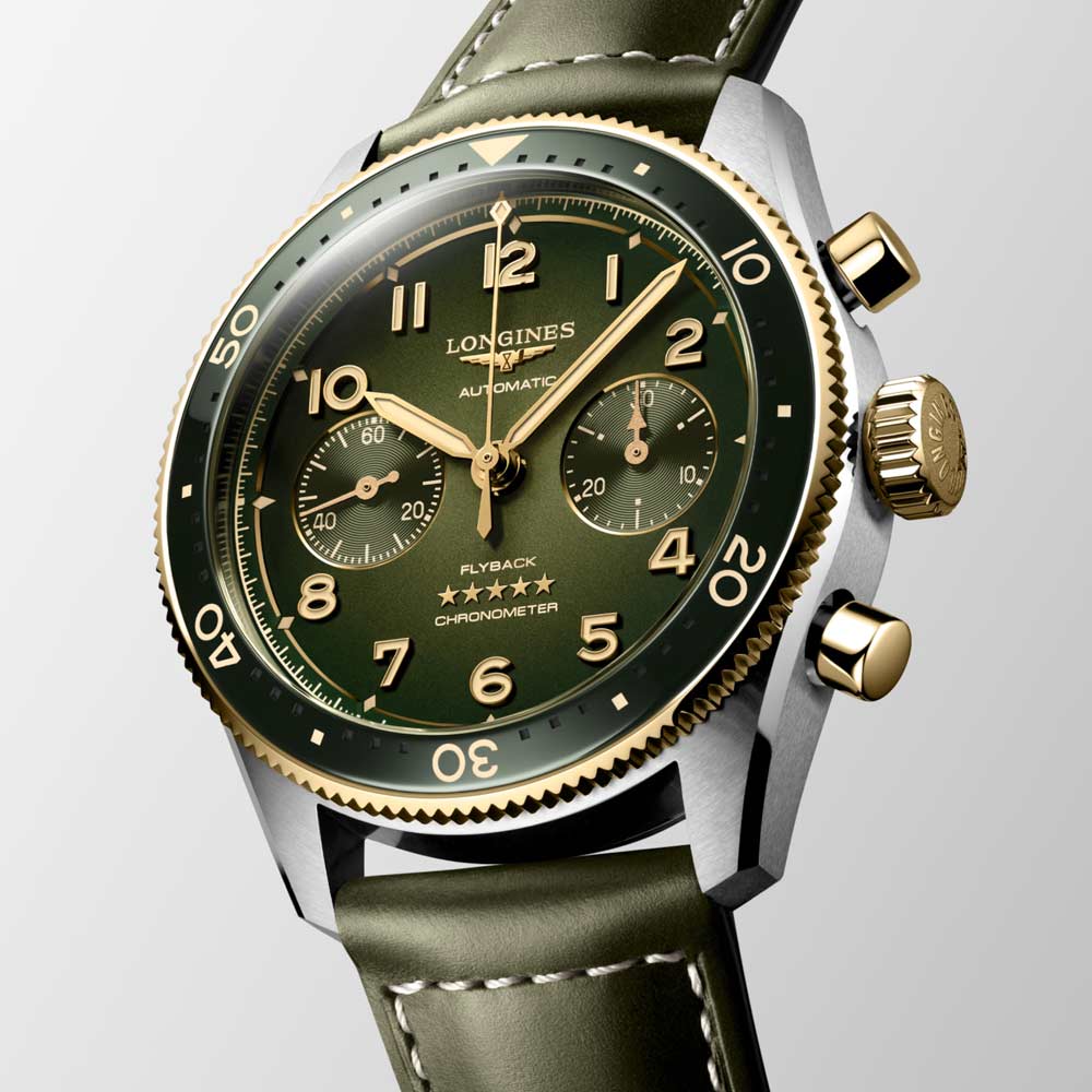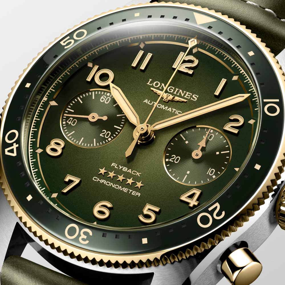 Longines Spirit Flyback in 42 Millimeter Durchmesser, Gehäuse aus Edelstahl mit 18 Karat Gelbgold Cap 200, Zifferblatt Grün mit degradierendem Farbverlauf und Swiss Super-LumiNova®. Kratzfestes Saphirglas mit mehreren Antireflexschichten auf beiden Seiten, mechanisches Uhrwerk mit Automatikaufzug, Flyback-Funktion und ca. 68 Stunden Gangreserve. Wasserdicht bis 10 bar.