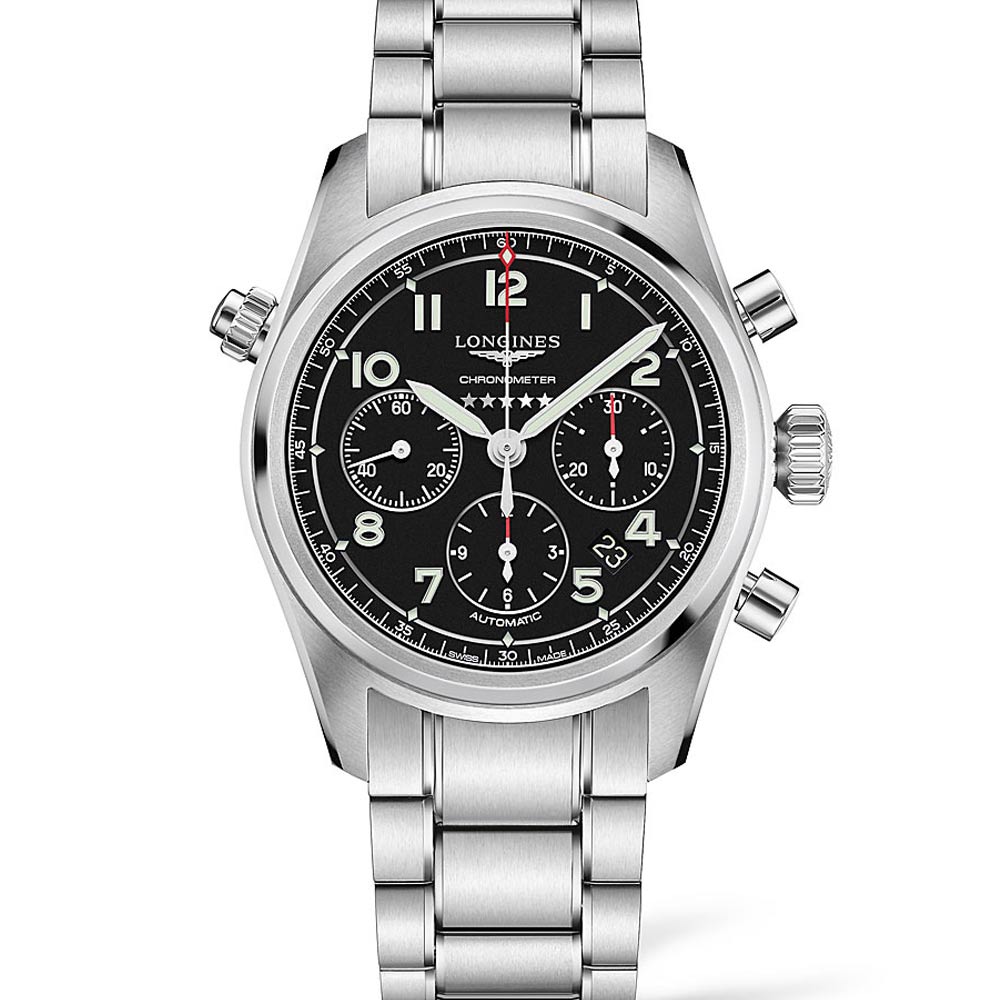 Longines Spirit in 42 Millimeter Durchmesser, Zifferblatt mattschwarz. Kratzfestes Saphirglas mit mehreren Antireflexschichten, mechanisches Uhrwerk mit Automatikaufzug. COSC-zertifizierter Chronometer, Säulenradchronograph. Armband und Gehäuse in Edelstahl.