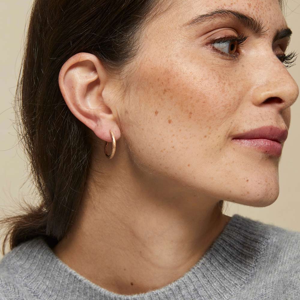 Diese schlichten, raffinierten Creolen vervollständigen die Bron-Kollektion. Durch den Austausch diverser  verfügbarer Einhänger können Sie Ihren Look für jeden Anlass anpassen. In warmen 18-karätigem Roségold.