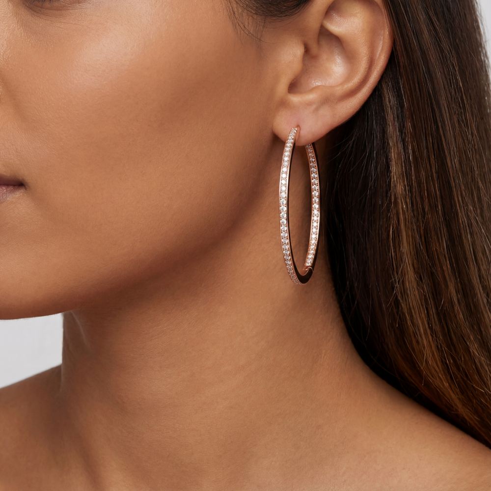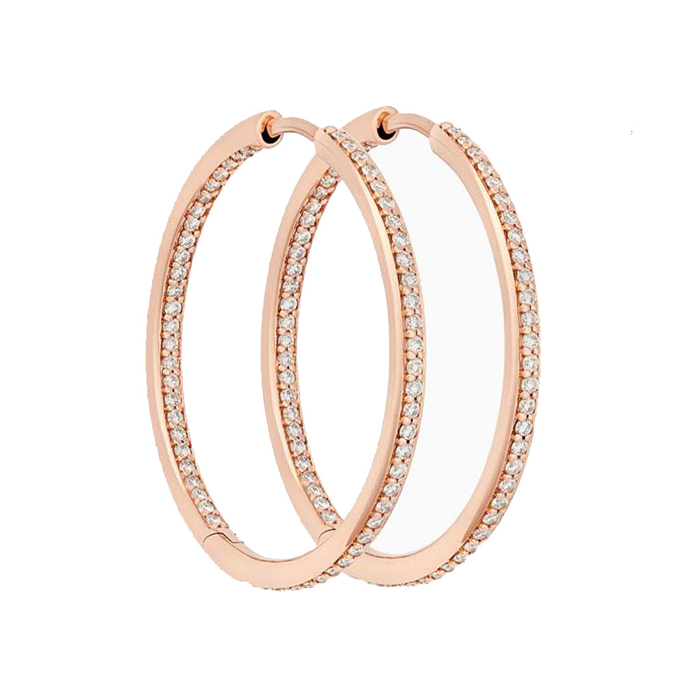 Ausdrucksstarke und moderne Creolen mit weißen Diamanten für einen besonderen Glanz! Eine Besonderheit sind die Diamanten auch im Innenbereich der Creolen. Gefertigt aus Roségold 18 Karat.