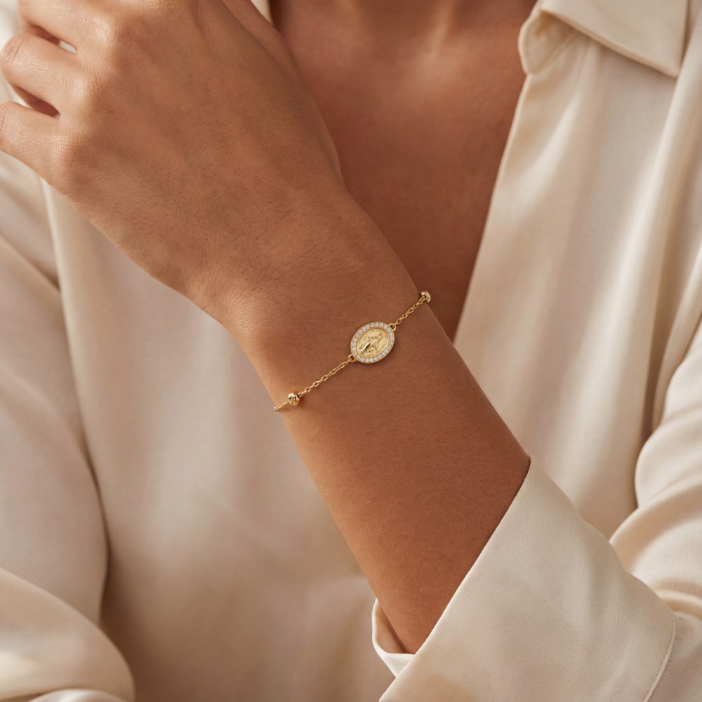 Armband mit einer geprägten Madonnen-Münze aus Gelbgold 750/-. Die Prägung Regina sine labe originali concepta O.P.N. steht sinnbildlich für die Schutzfunktion der Münze und geht auf eine geschichtliche Begebenheit aus dem 19. Jahrhundert zurück.