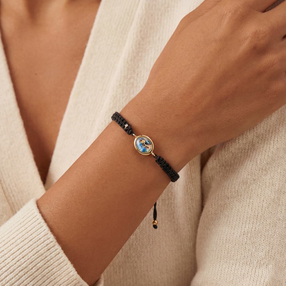 Armband mit gemäldeartigem Madonnen-Amulett und geflochtenem, schwarzen Armband. Das Armband lässt sich beim Anlegen straffziehen und dadurch stufenlos einstellen. Im Armband selbst ist ein kleiner in Roségold gefasster Diamant integriert. Mit der Madonna als Symbol für Liebe, Schutz und Geborgenheit ist das Armband jederzeit ein wertvoller Begleiter. Gefertigt aus Roségold 750/-.