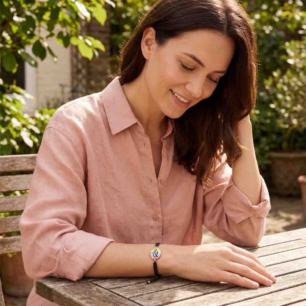 Armband mit gemäldeartigem Madonnen-Amulett und geflochtenem, schwarzen Armband. Das Armband lässt sich beim Anlegen straffziehen und dadurch stufenlos einstellen. Im Armband selbst ist ein kleiner in Roségold gefasster Diamant integriert. Mit der Madonna als Symbol für Liebe, Schutz und Geborgenheit ist das Armband jederzeit ein wertvoller Begleiter. Gefertigt aus Roségold 750/-.