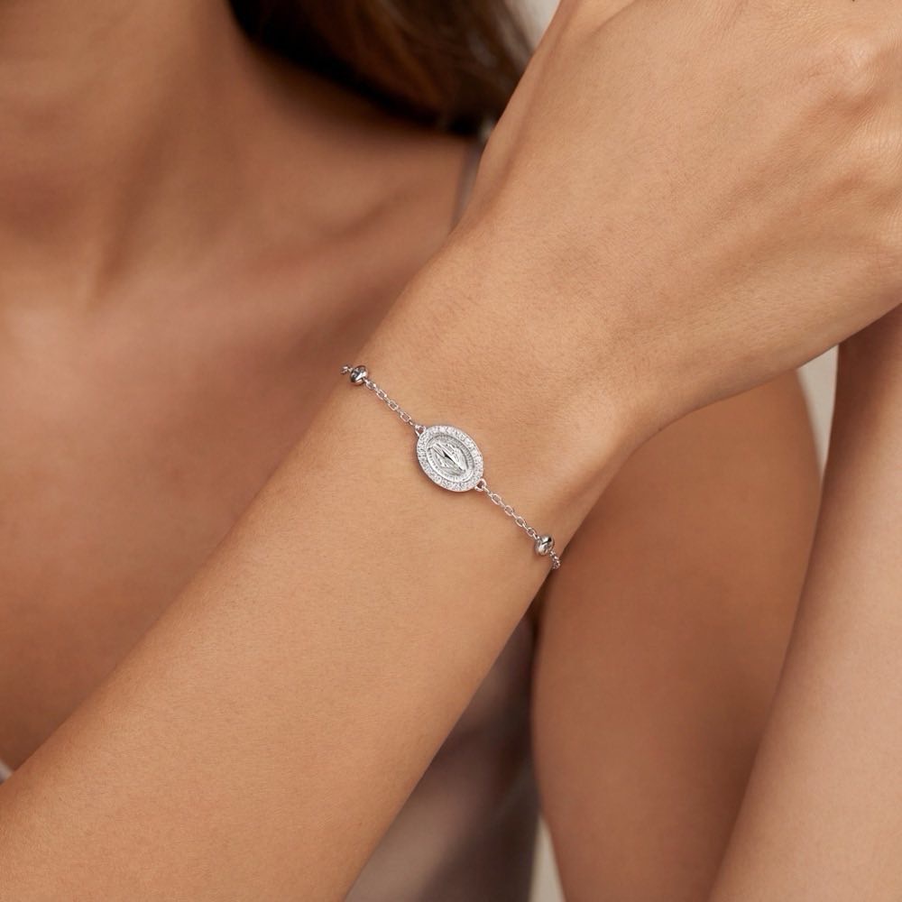 Armband mit einer geprägten Madonnen-Münze aus Weißgold 750/-. Die Prägung Regina sine labe originali concepta O.P.N. steht sinnbildlich für die Schutzfunktion der Münze und geht auf eine geschichtliche Begebenheit aus dem 19. Jahrhundert zurück.
