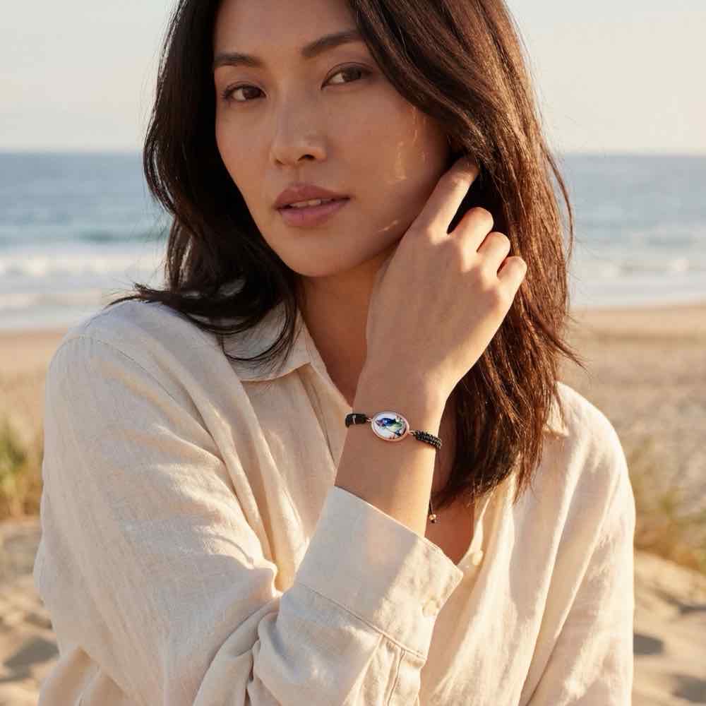 Armband mit gemäldeartigem Madonnen-Amulett und geflochtenem, schwarzen Armband. Das Armband lässt sich beim Anlegen straffziehen und dadurch stufenlos einstellen. Im Armband selbst ist ein kleiner in Roségold gefasster Diamant integriert. Mit der Madonna als Symbol für Liebe, Schutz und Geborgenheit ist das Armband jederzeit ein wertvoller Begleiter. Gefertigt aus Roségold 750/-.