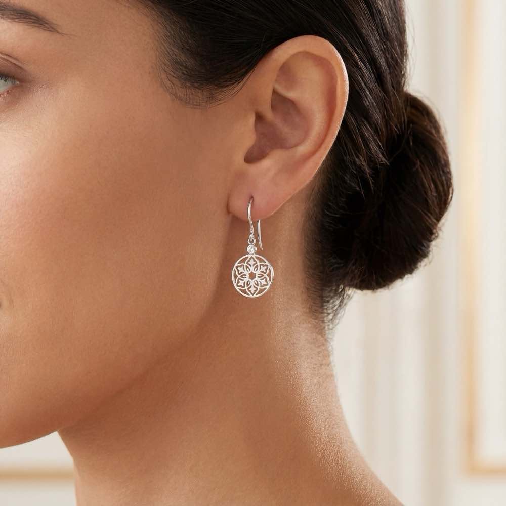 Diese charmanten Ohrringe bestechen durch ihr zartes und ornamentales Muster. Sehr zierlich und doch edel wirkt der in feiner Handarbeit aus frischem Weißgold 750/- gearbeitete Ohrschmuck.