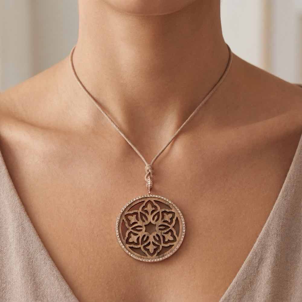 Dieser zarte und ornamentale Halsschmuck aus Walnussholz ist mit einem zierlichen Kranz aus zimtfarbenen Diamanten im runden Brillantschliff umrahmt. Eine feinste Handarbeit aus warmem Roségold 750/- zeichnet diesen zarten Anhänger aus.
