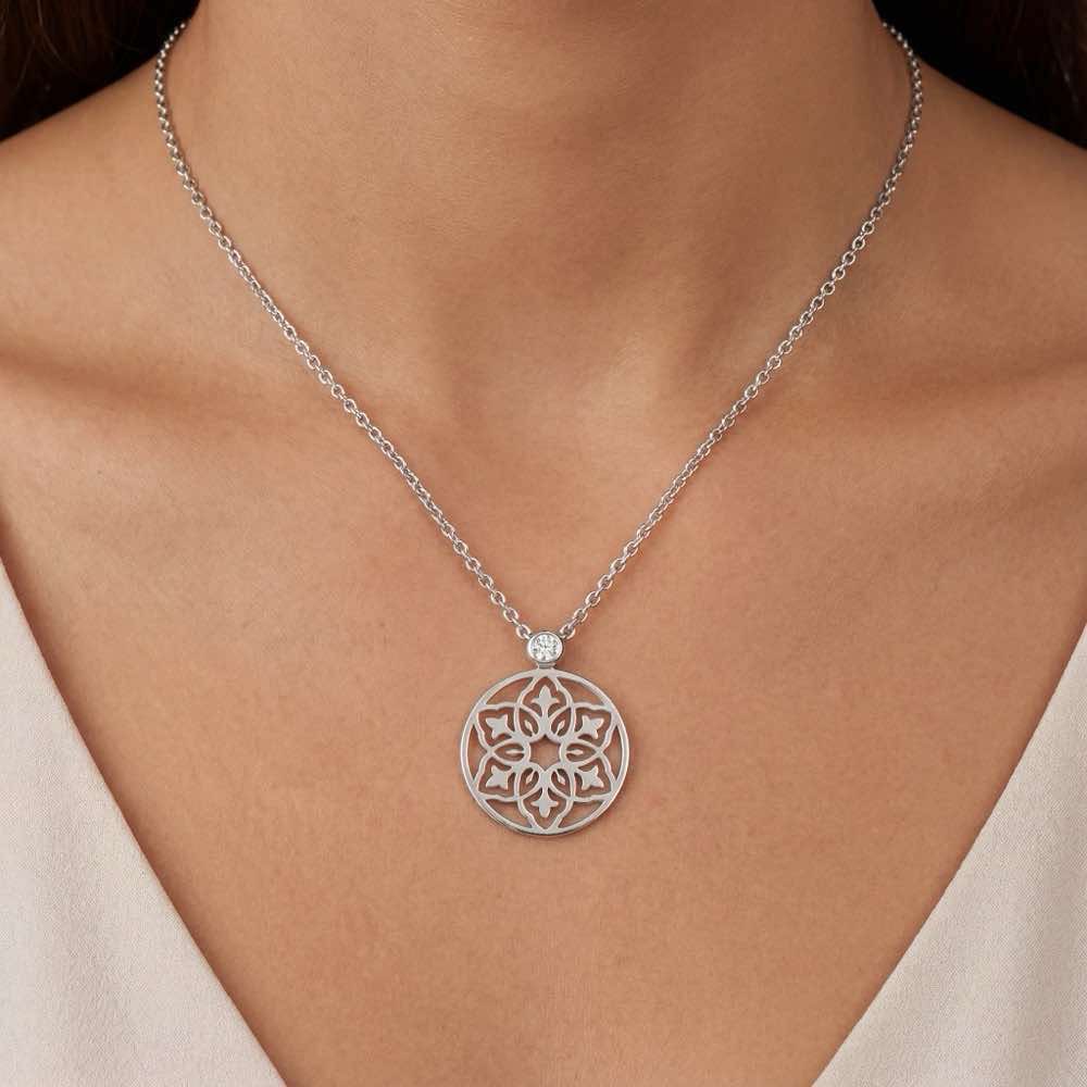 Dieser zarte und ornamentale Halsschmuck ist ein stilvoller und schicker Begleiter für jden Tag. Feinste Handarbeit aus frischem Weißgold 750/- zeichnet diesen zarten Anhänger aus.
