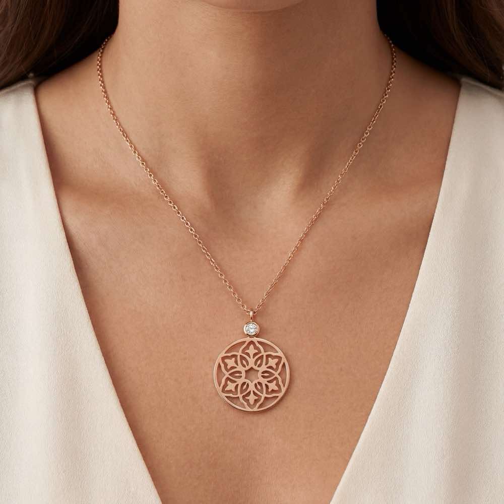Dieser zarte und ornamentale Halsschmuck ist ein stilvoller und schicker Begleiter für jden Tag. Feinste Handarbeit aus warmem Roségold 750/- zeichnet diesen zarten Anhänger aus.