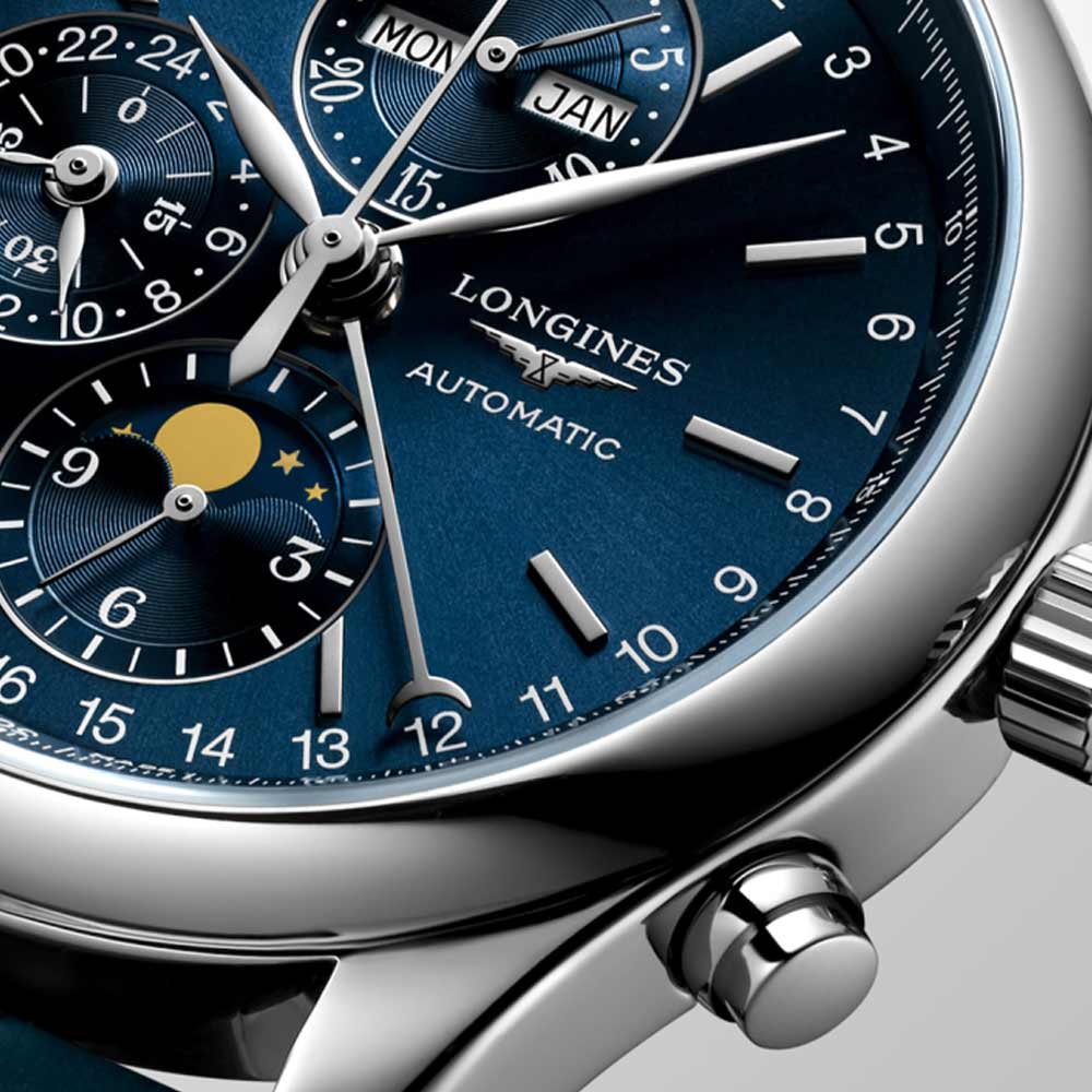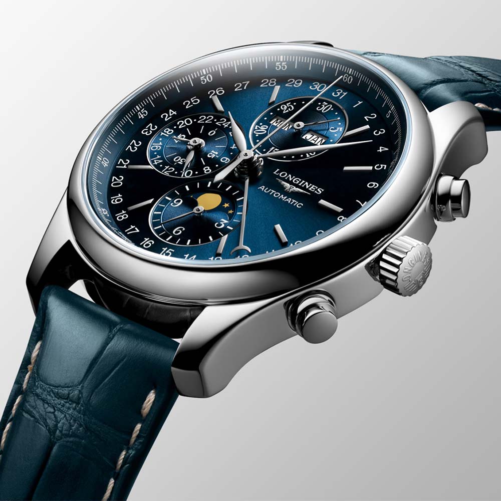 Longines Master Collection Chronograph mit einem Durchmesser von 42 Millimetern und einem blauem Zifferblatt mit "Sonnenstrahl"-Dekor. Kratzfestes Saphirglas, mechanisches Uhrwerk mit Chronographenfunktion und automatischem Selbstaufzug, Mondphase. Gehäuse aus Edelstahl, mattblaues Alligatorlederarmband mit Sicherheitsfaltschließe.
