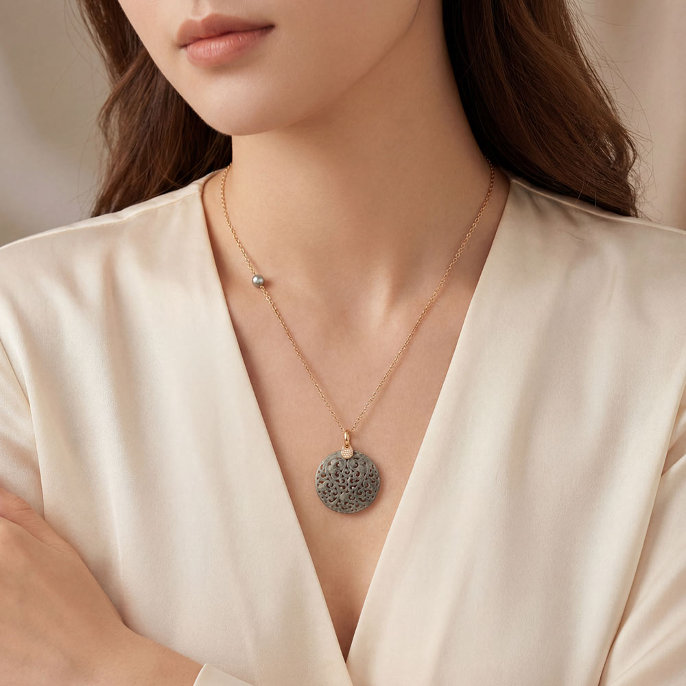 Raffinierter Halsschmuck mit dem gewissen Etwas aus geschnitzter grauer Jade, einer silbergrau schimmernden Tahiti-Zuchtperle exzellenter Qualität sowie fein weißen Diamanten. Gefertigt aus warmem Roségold 750/-. Trés chic!