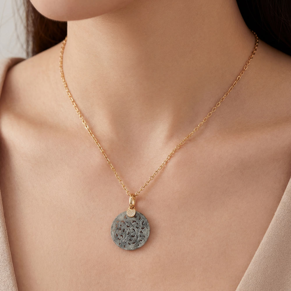 Raffinierter Halsschmuck mit dem gewissen Etwas aus geschnitzter grauer Jade sowie fein weißen Diamanten. Gefertigt aus warmem Roségold 750/-. Trés chic!