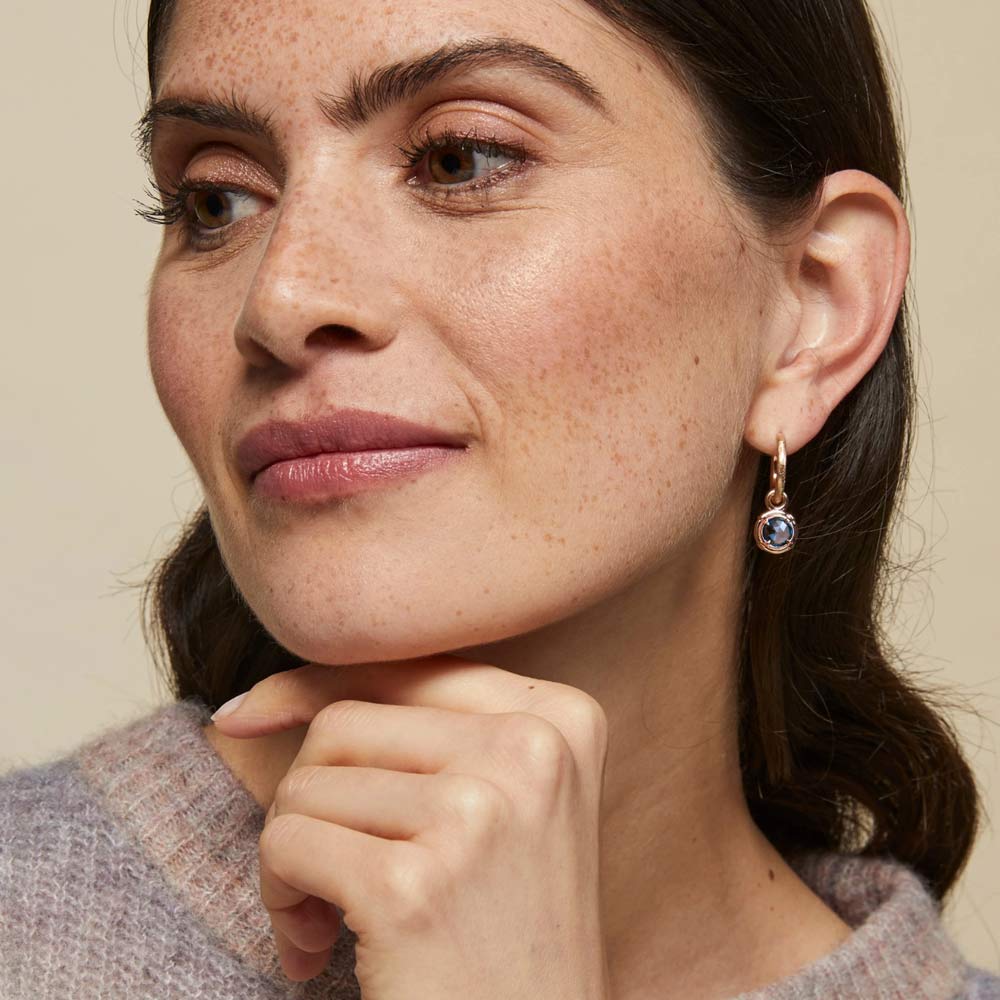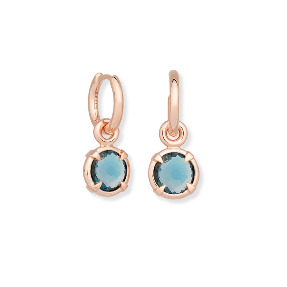 Diese Einhänger erinnern an die Tiefe des saphirblauen Ozeans: Ein leuchtender London Blue Topas im Briolett-Schliff ist besonderer Blickfang, gefasst in edlem 18-karätigen Roségold. Creolen separat erhältlich.