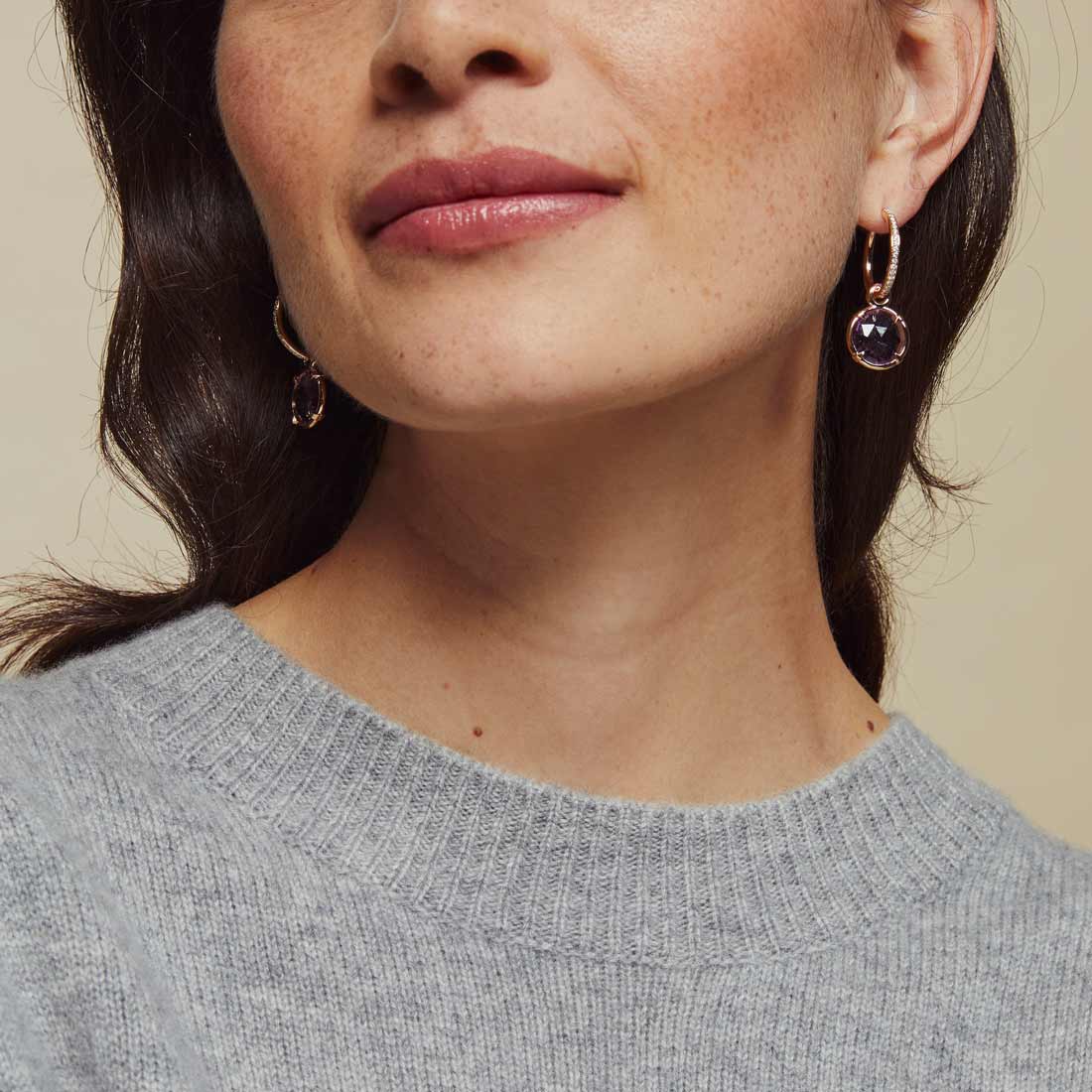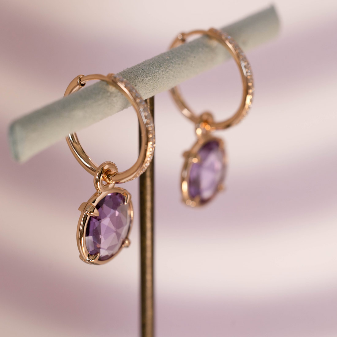 Mira Mira Einhänger mit Amethyst im Briolett-Schliff hat einen sehr schmeichelhaften Farbton. Creolen separat erhältlich. Gefertigt aus Roségold 18 Karat.