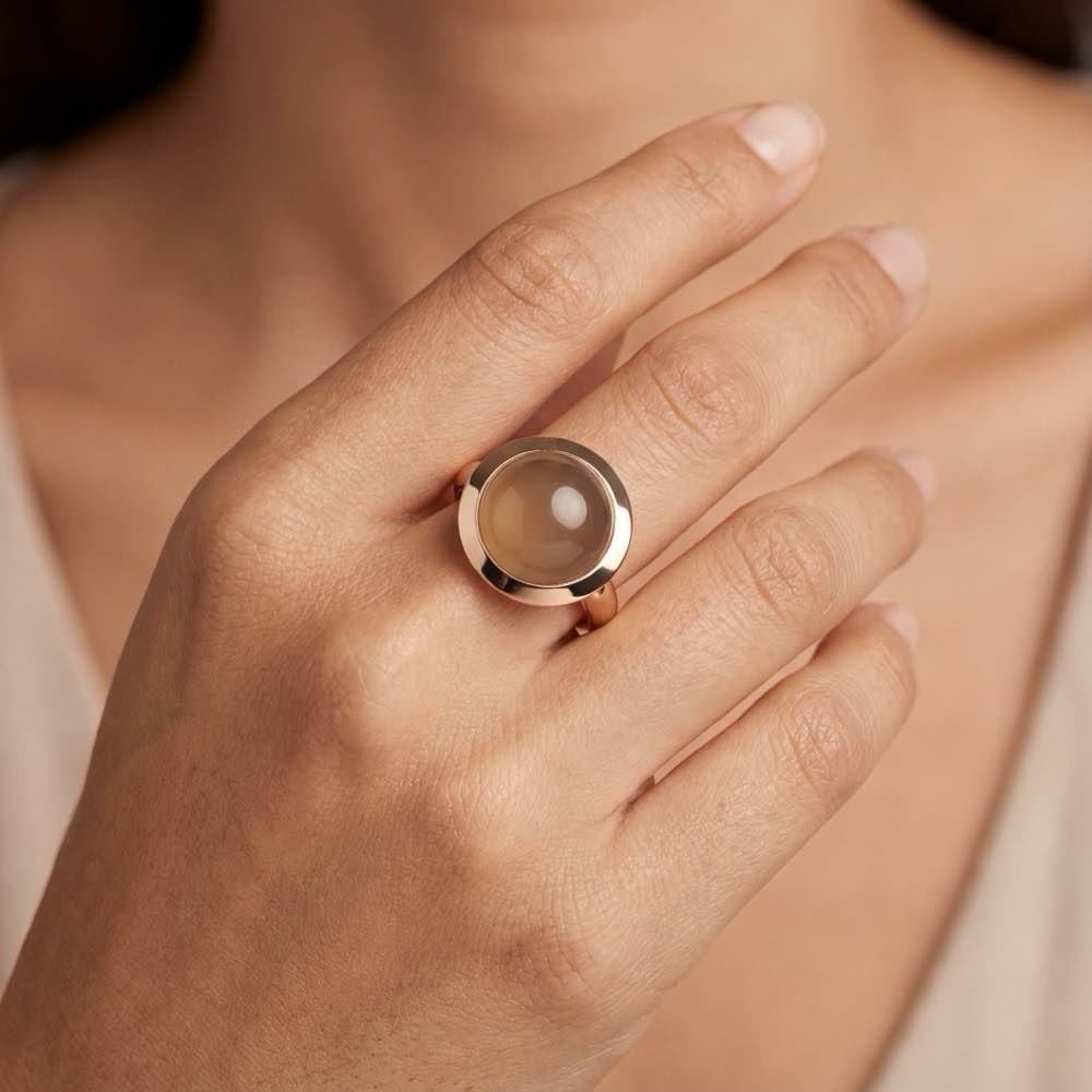 Sportlicher Ring mit einem braunen Mondsteinen. Gefertigt aus edlem Roségold 18 Karat.