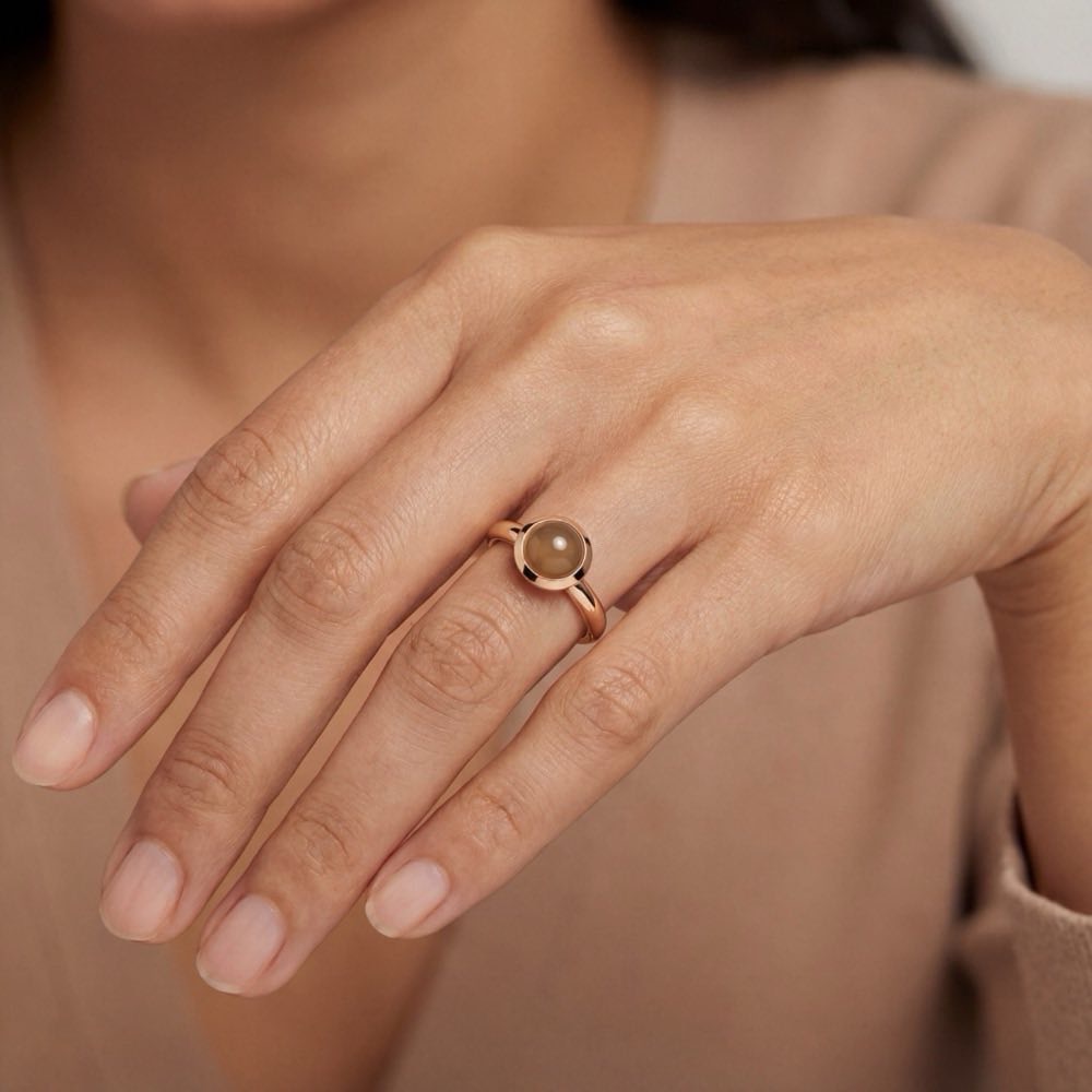 Sportlicher Ring mit einem weißen Mondsteinen. Gefertigt aus edlem Roségold 18 Karat.
