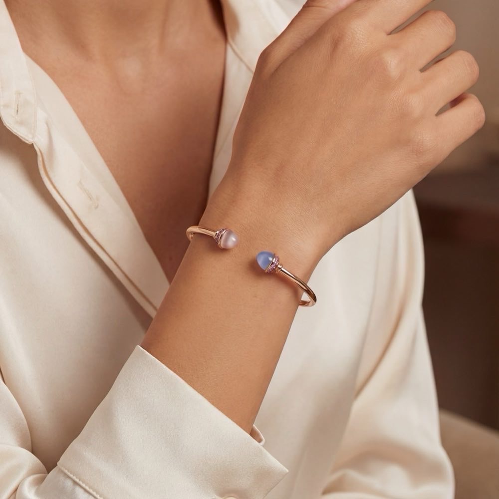 Flexible Armspange zum Überstreifen mit einer außergewöhnlichen Farbkombination zweier Edelsteine im Cabochon-Schliff. Gefertigt aus warmem 18-karätigem Roségold. Einfach überstreifen und mit weiteren Armspangen kombinieren.