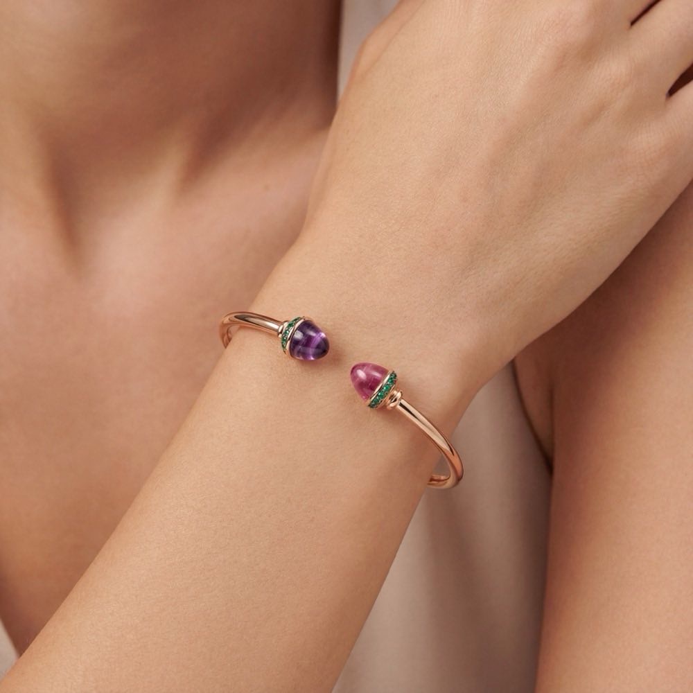 Flexible Armspange zum Überstreifen mit einer außergewöhnlichen Farbkombination zweier Edelsteine im Cabochon-Schliff. Gefertigt aus warmem 18-karätigem Roségold. Einfach überstreifen und mit weiteren Armspangen kombinieren.