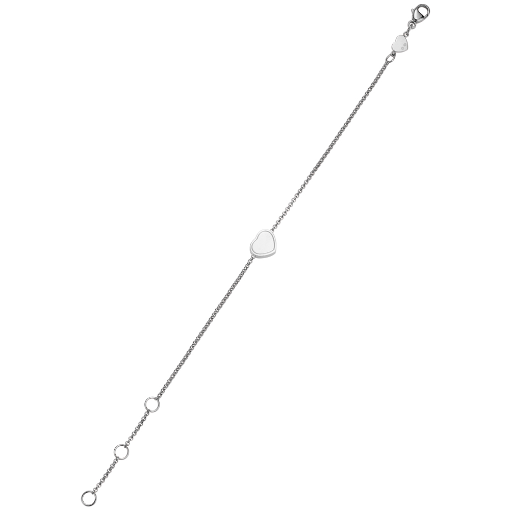 Filigranes My Happy Hearts Armband aus 18-karätigem Weißgold. Das zentrale Herzmotiv, veredelt mit Diamanten, erzeugt ein klares, lebendiges Funkeln. Als Symbol für Liebe und Verbundenheit wird dieses zarte Schmuckstück zu einem bedeutungsvollen Begleiter für jeden Tag.
