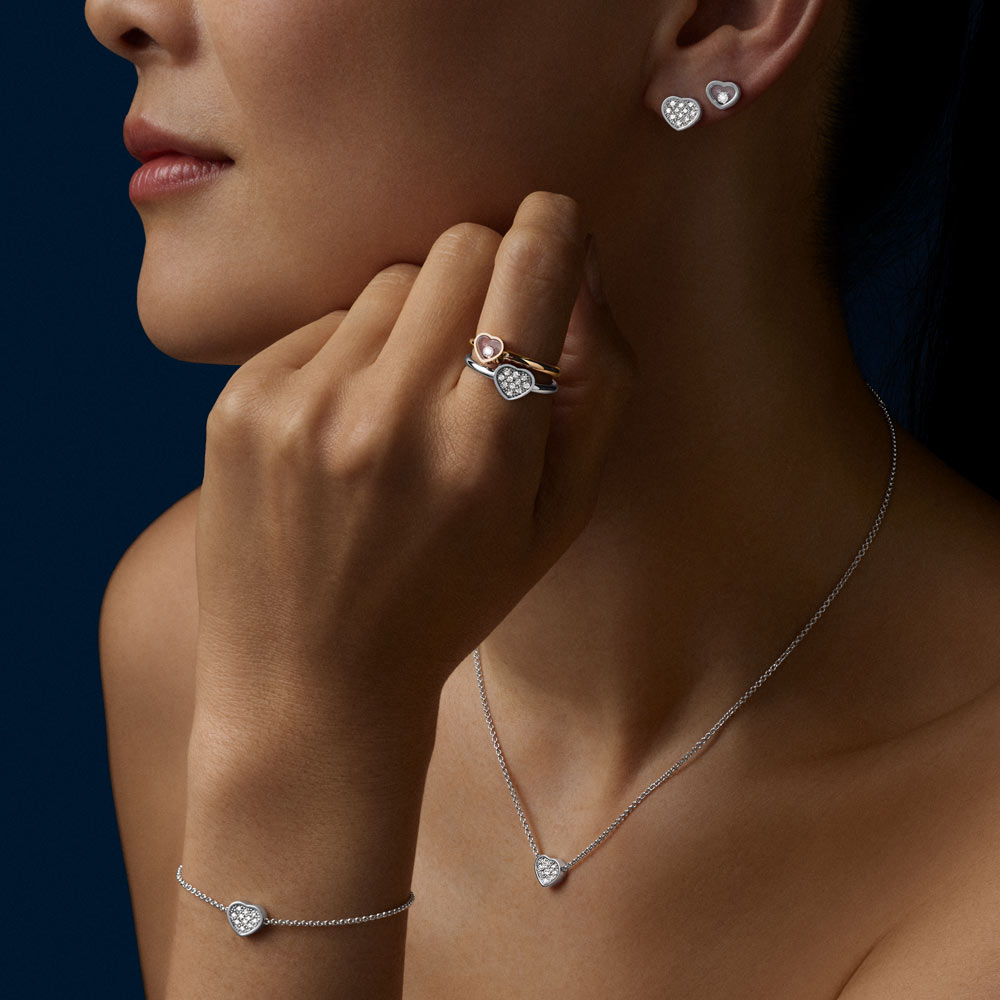Die Schmucklinie My Happy Hearts greift die ikonischen Designcodes der legendären Chopard-Kreationen auf: das Herzmotiv und die frei beweglichen Diamanten. Die filigranen Diamantarmbänder dieser Kollektion können einzeln oder im Layering getragen werden und verleihen jedem Look einen modernen, stilvollen Akzent. Me, Myself and My Happy Hearts.