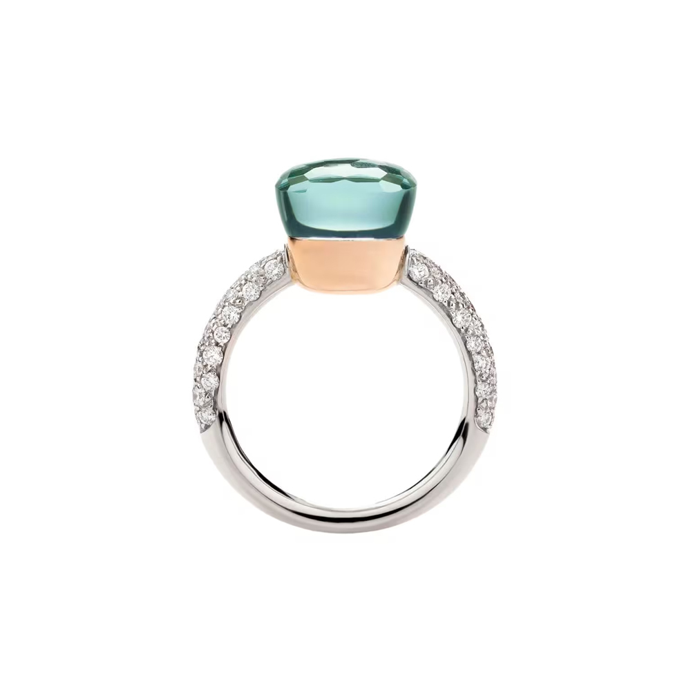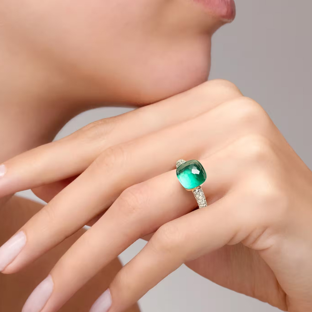 Die Ring-Ikone von Pomellato mit einer türkisgrün schimmernden Dublette aus Blautopas und Achat im Zentrum. Die Ringschiene ist aus Roségold 750/- gefertigt, die kaum sichtbare Fassung aus Weißgold 750/-. Ein must-have!