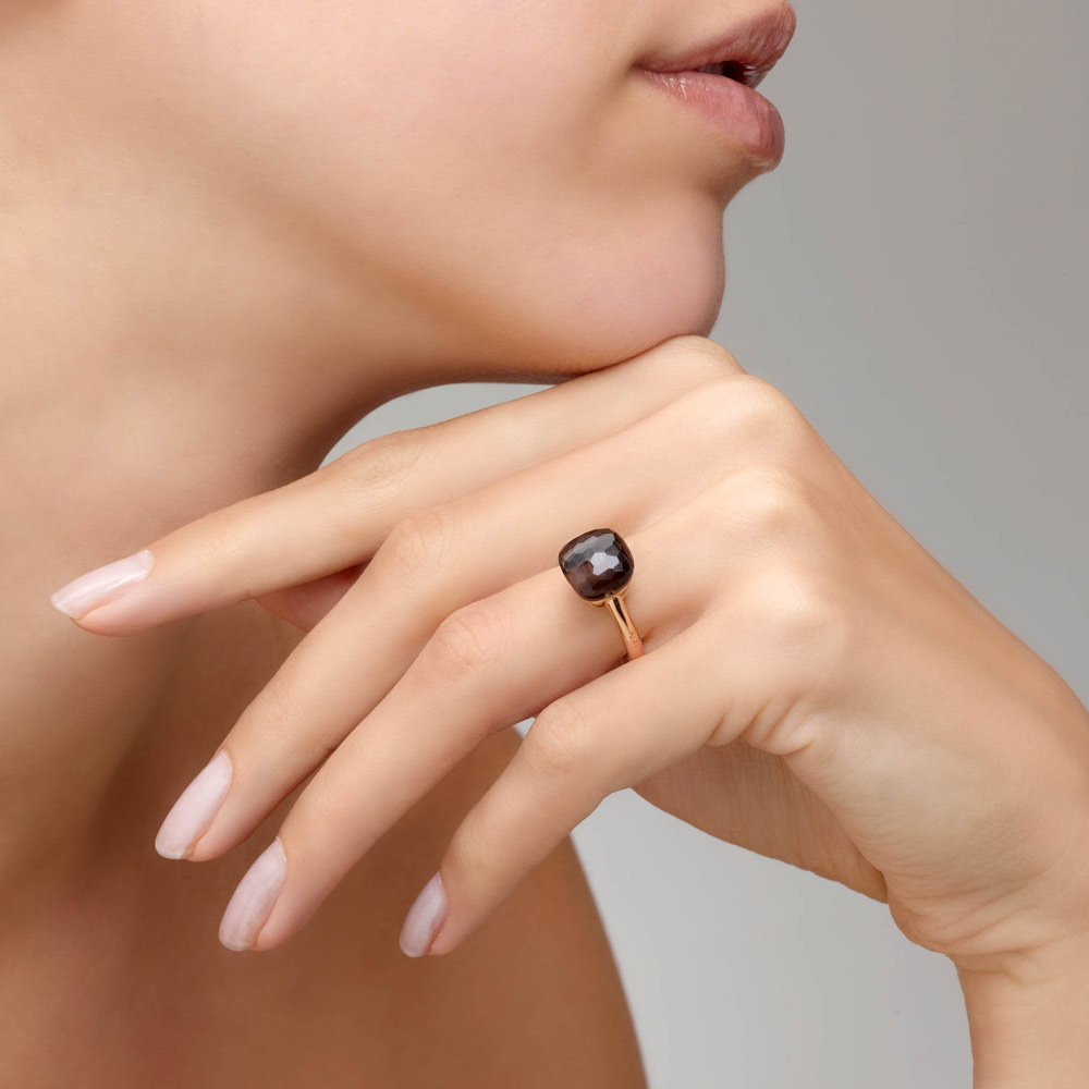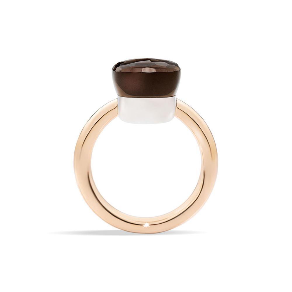 Die ikonische Pomellato-Ringkreation präsentiert sich mit einem edlen Rauchquarz im Zentrum. Die Ringschiene besteht aus feinstem 750/- Roségold, während die nahezu unsichtbare Fassung aus 750/- Weißgold gefertigt ist. Ein unverzichtbares Schmuckstück für Liebhaber zeitloser Eleganz!