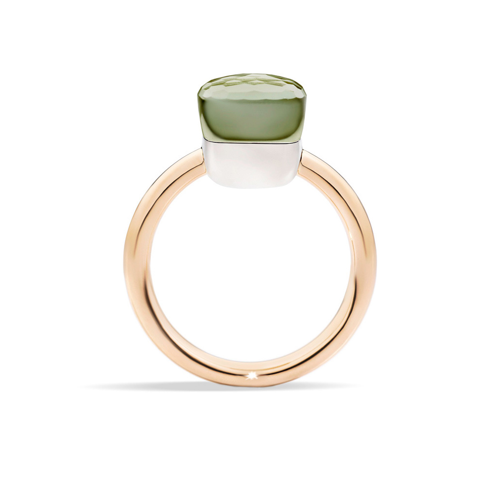 Die Ring-Ikone von Pomellato mit einem zartgrünen Prasiolith im Zentrum. Ringschiene in Roségold 750/-. Fassung in Weißgold 750/-. Mit anderen NUDO Ringen vielfältig kombinierbar. Ein must-have!