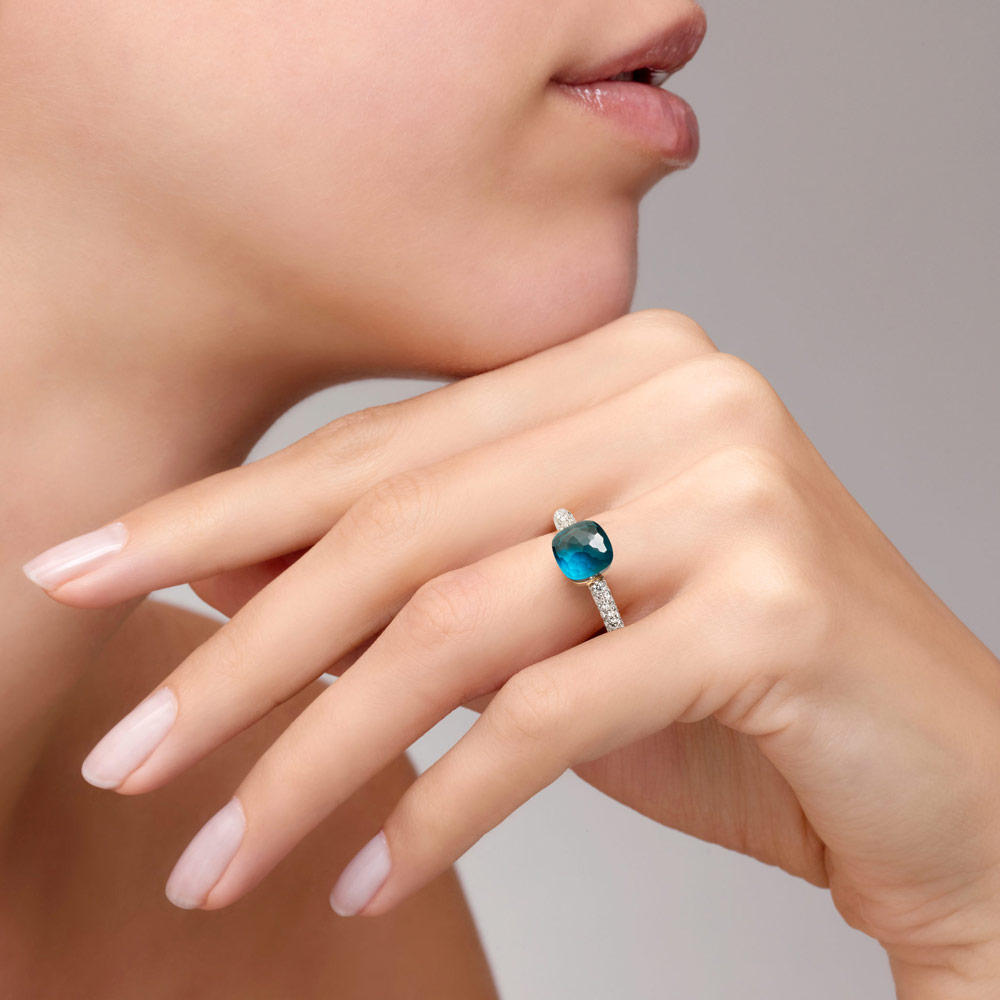 Der wundervoll in lebhaftem Blau funkelnde Nudo Ring, fällt durch seine ganz neue Kombination aus Londontopas und einem Diamant-Pavé auf.  Trés chic!