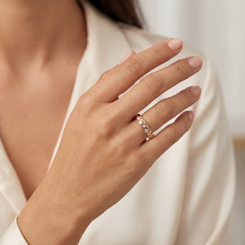 Charmanter Memoirering mit fein weißen Diamanten im Brillantschliff. Gehalten werden diese strahlend weißen Brillanten jeweils von einem zarten Paisley-Motiv, gearbeitet aus warmem Roségold 750/-.