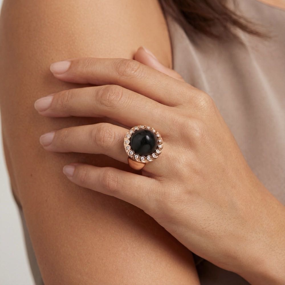 Exclusiver Ring mit reinem Ebenholz im Cabouchonschliff und fein weißen Diamanten im Brillantschliff. Der edle Ebenholzcabouchon wird umrahmt von einem Kranz klassischer Paisley-Motive, die jeweils einen strahlenden Brillanten zieren. Feinste Handarbeit aus warmem Roségold 750/- macht aus diesem Ring ein Meisterstück.
