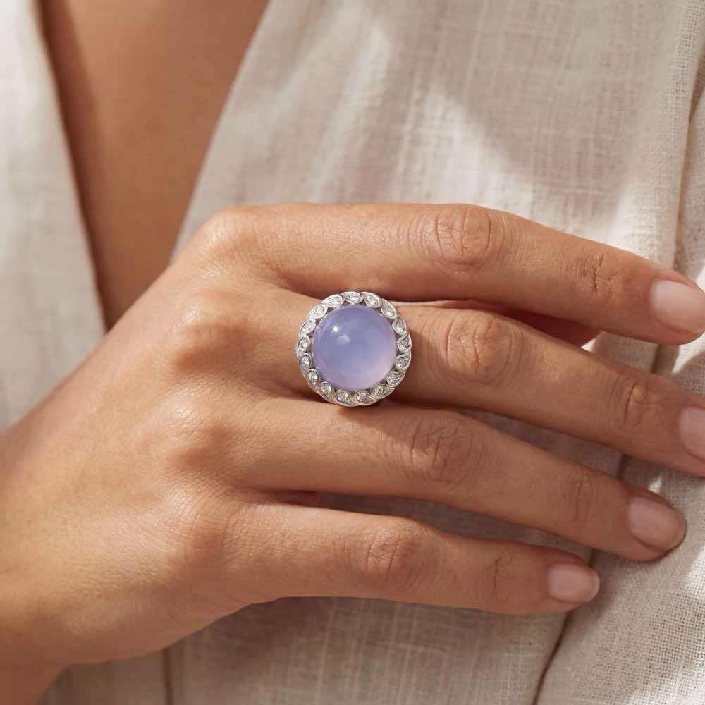 Exzellenter Ring mit einem schmeichelndem Chalcedon im Cabouchonschliff, umrahmt von fein weißen Diamanten im runden Brillantschliff. Die strahlend weißen Brillanten werden jeweils von einem feinen Paisley-Motiv gehalten. Feine Handarbeit aus hochwertigem Weißgold 750/- vollendet dieses ausgefallene Schmuckstück.