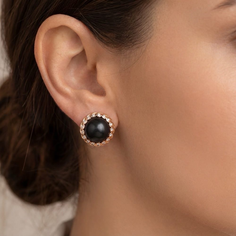 Außergewöhnlicher Ohrschmuck mit edlem Ebenholz im Cabouchon-Schliff, umrahmt von einem feinen Kranz mit fein weißen Brillanten gefüllten Paisyley-Motiven. Eine in feiner Handarbeit gefertigte Fassung aus warmem Roségold 750/- vollendet diese stilvollen Ohrringe.