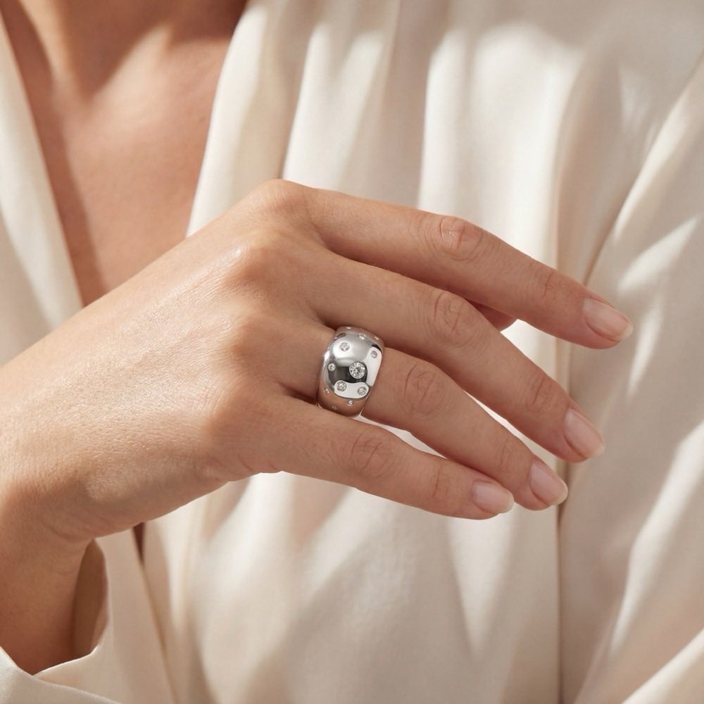 Ausdrucksstarker Ring mit fein weißen Diamanten im runden Brillantschliff. Durch seine bauchige Form hat er ein perfektes Tragegefühl und schmiegt sich dem Finger wunderbar an. Wie Sterne am Firmament strahlen die weißen Brillanten in hochwertig gearbeitetem Weißgold 750/-.