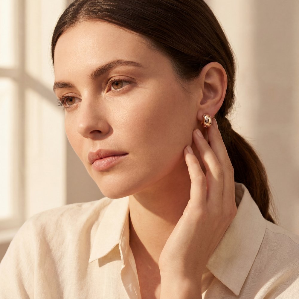 Schicke und formschöne Creolen mit fein weißen Diamanten im runden Brillantschliff, angefertigt aus warmem Roségold 750/-. Zu jedem Outfit ein stilvoller Begleiter.
