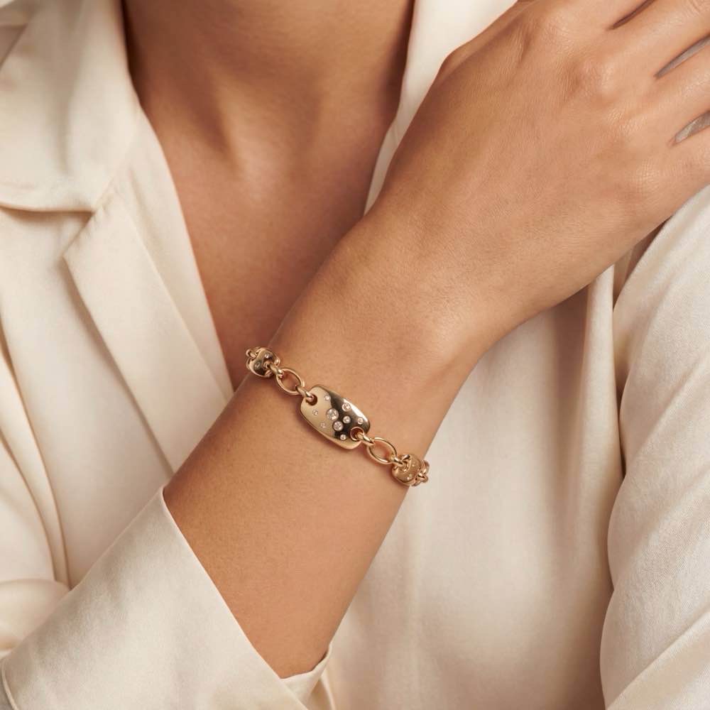 Ausdrucksstarker Armschmuck mit fein weißen und braunen Diamanten im runden Brillantschliff. Ganz zart und wie zufällig gestreut sind die edlen Brillanten in hochwertig gearbeitetem Roségold 750/- gefasst.