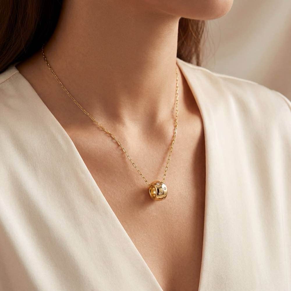 Edler und zugleich sportlicher Halsschmuck mit einem rondenförmigen Anhänger. Ausgefasst mit fein weißen Diamanten im Brillantschliff und einem verspielten Collierkettchen aus hochwertigem Gelbgold 750/-.