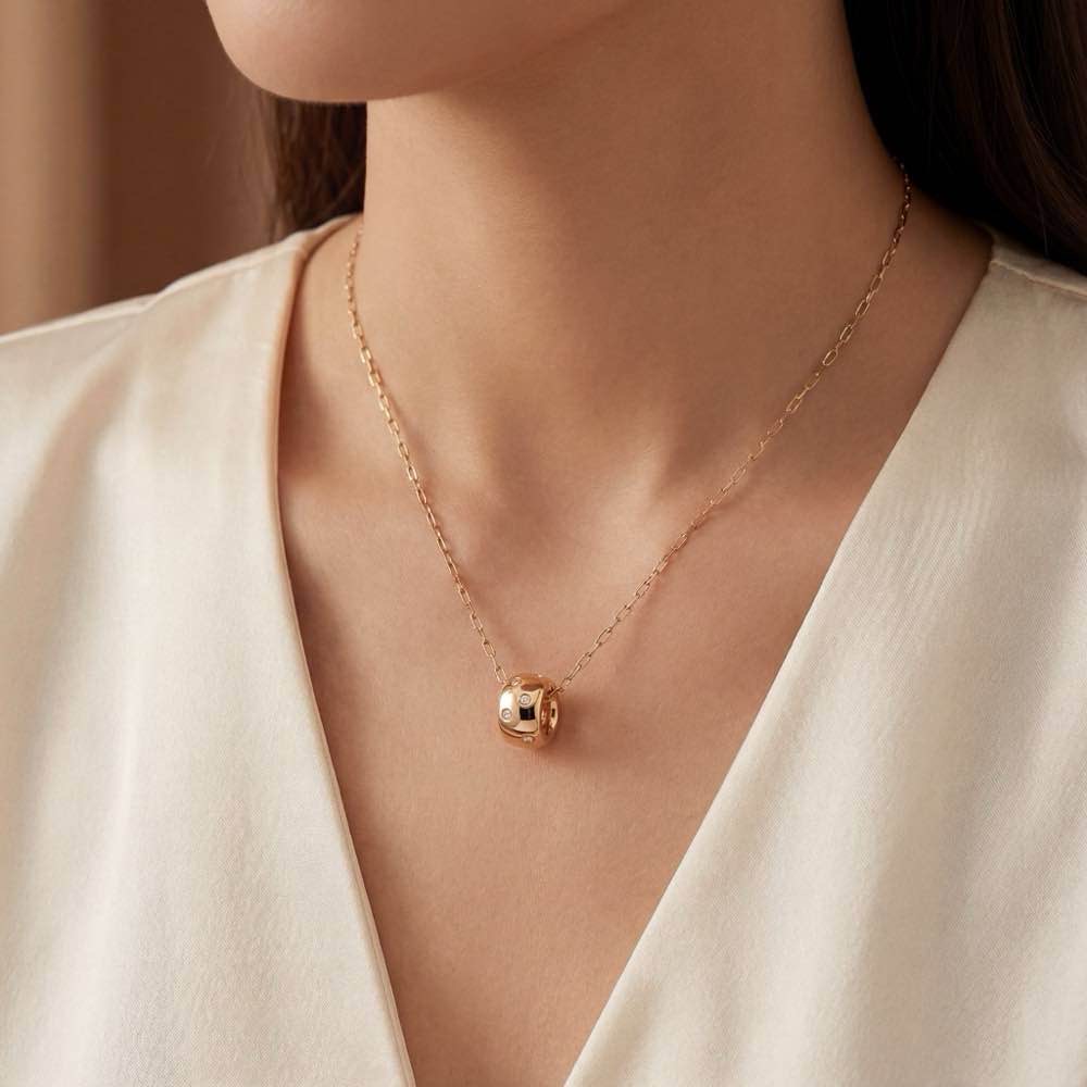 Edler und zugleich sportlicher Halsschmuck mit einem rondenförmigen Anhänger. Ausgefasst mit fein weißen Diamanten im Brillantschliff und einem verspielten Collierkettchen aus warmem Roségold 750/-.