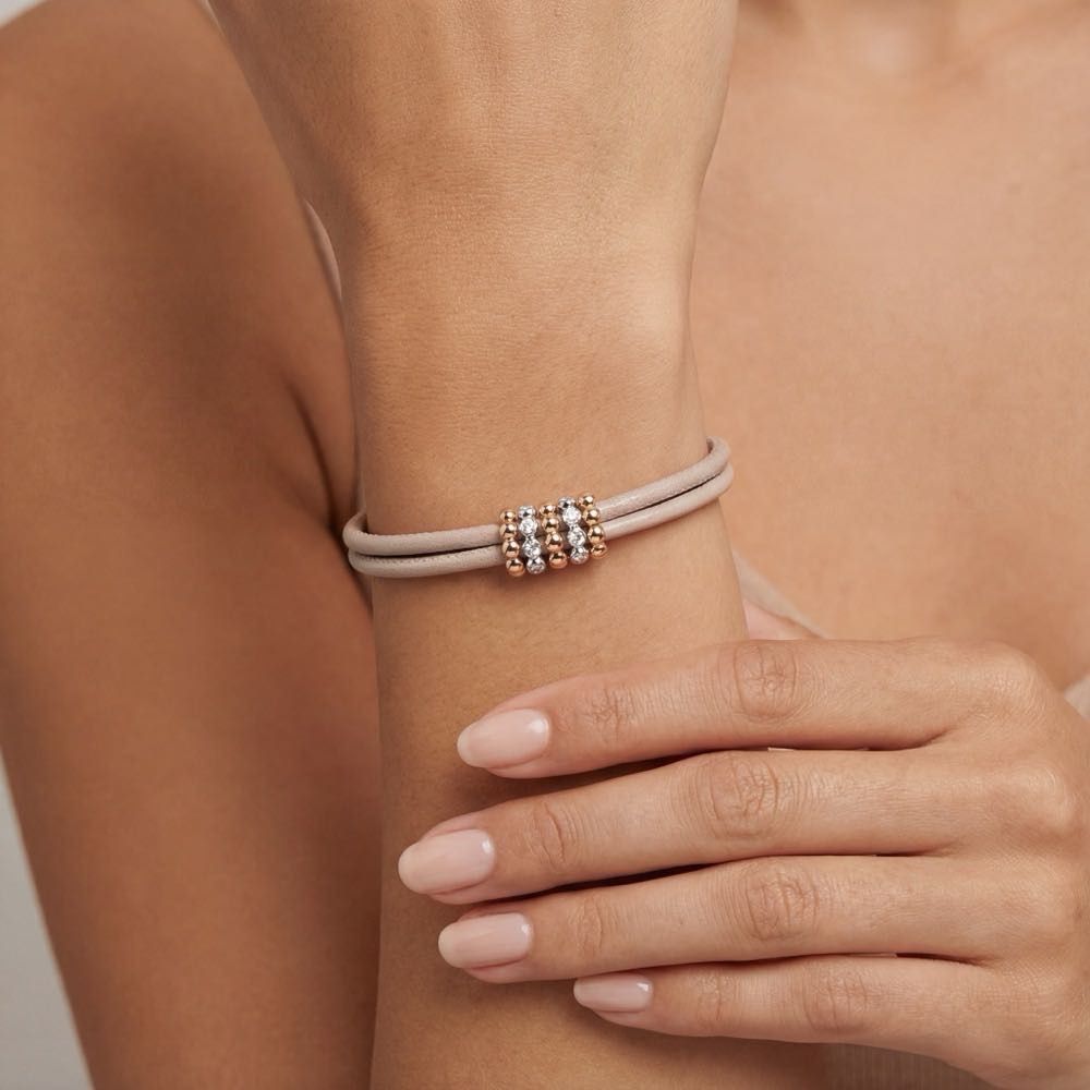 Sportlicher Armschmuck aus dreireihigem, weichem Kalbsleder, der von zarten Kugelreifen aus Weiß- und Roségold umspielt wird. Fein weiße Diamanten verleihen diesem lässigen Armschmuck das besondere Etwas.