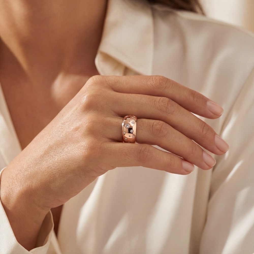 Bezaubernder Ring mit einigen fein weißen Diamanten im runden Brillantschliff und mehreren fantasiefarben braunen Brillanten. In unregelmäßiger Anordnung sind diese besonderen Edelsteine wie zufällig zart eingefasst in eine harmonisch abgerundete Ringschiene aus warmem Roségold 750/-. Ein wahrer Blickfang, den Sie nicht mehr vermissen möchten!