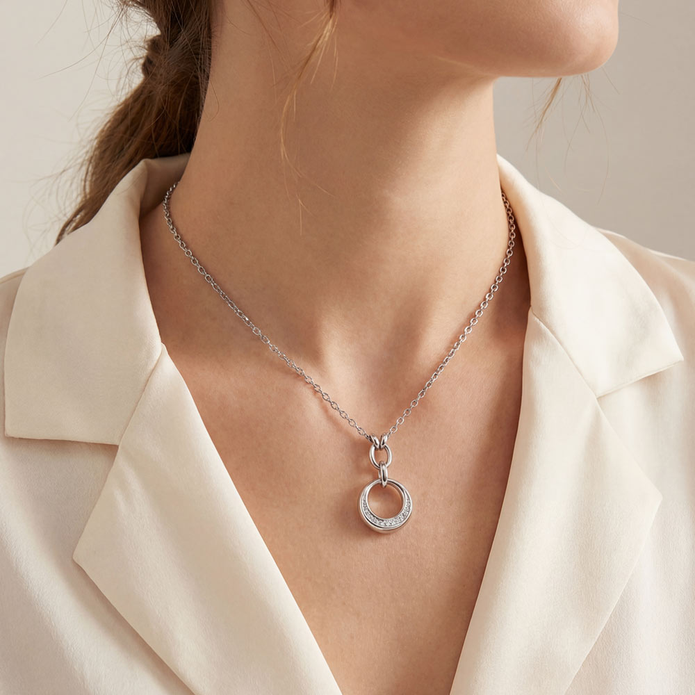 Charmanter Halsschmuck mit fein weißen Diamanten im runden Brillantschliff. Ein bezaubernder, ringförmiger Anhänger, in Handarbeit aus hochwertigem Weißgold 750/- gefertigt, bringt die weißen, halbmondförmig angeordneten Brillanten unterschiedlicher Größe meisterlich zum Strahlen.