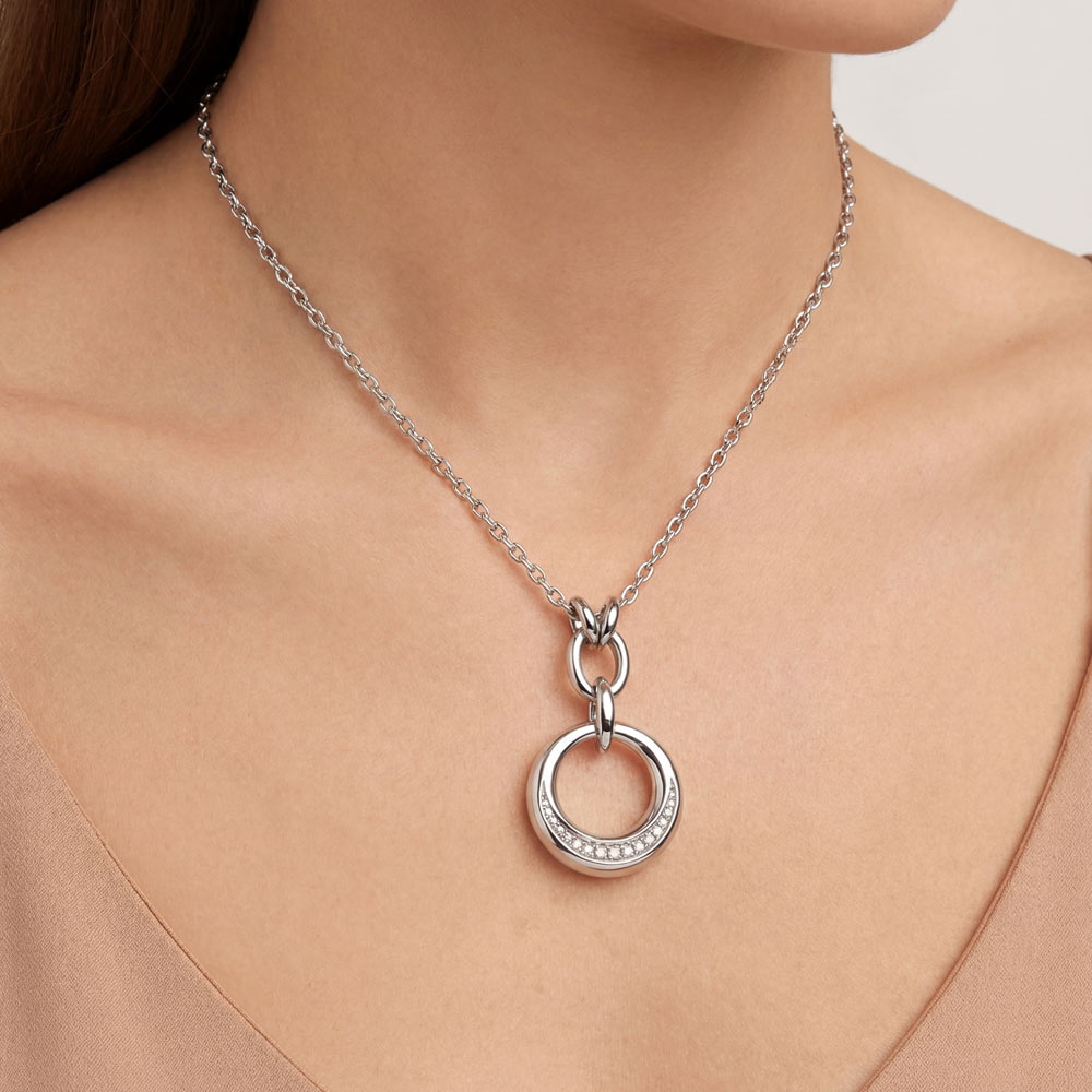 Bezaubernder Halsschmuck mit fein weißen Diamanten im runden Brillantschliff. Ein edler, ringförmiger Anhänger, gearbeitet aus hochwertigem Weißgold 750/-, bringt die feinen Edelsteine besonders zum Strahlen.